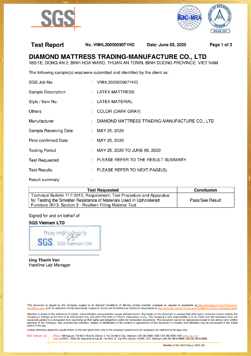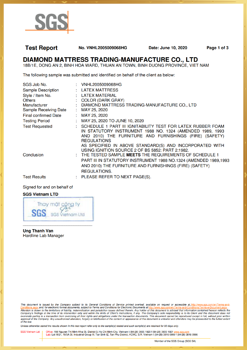 SGS - Thụy Sĩ: sản phẩm nệm cao su thiên nhiên 100% kháng cháy tiêu chuẩn Mỹ.